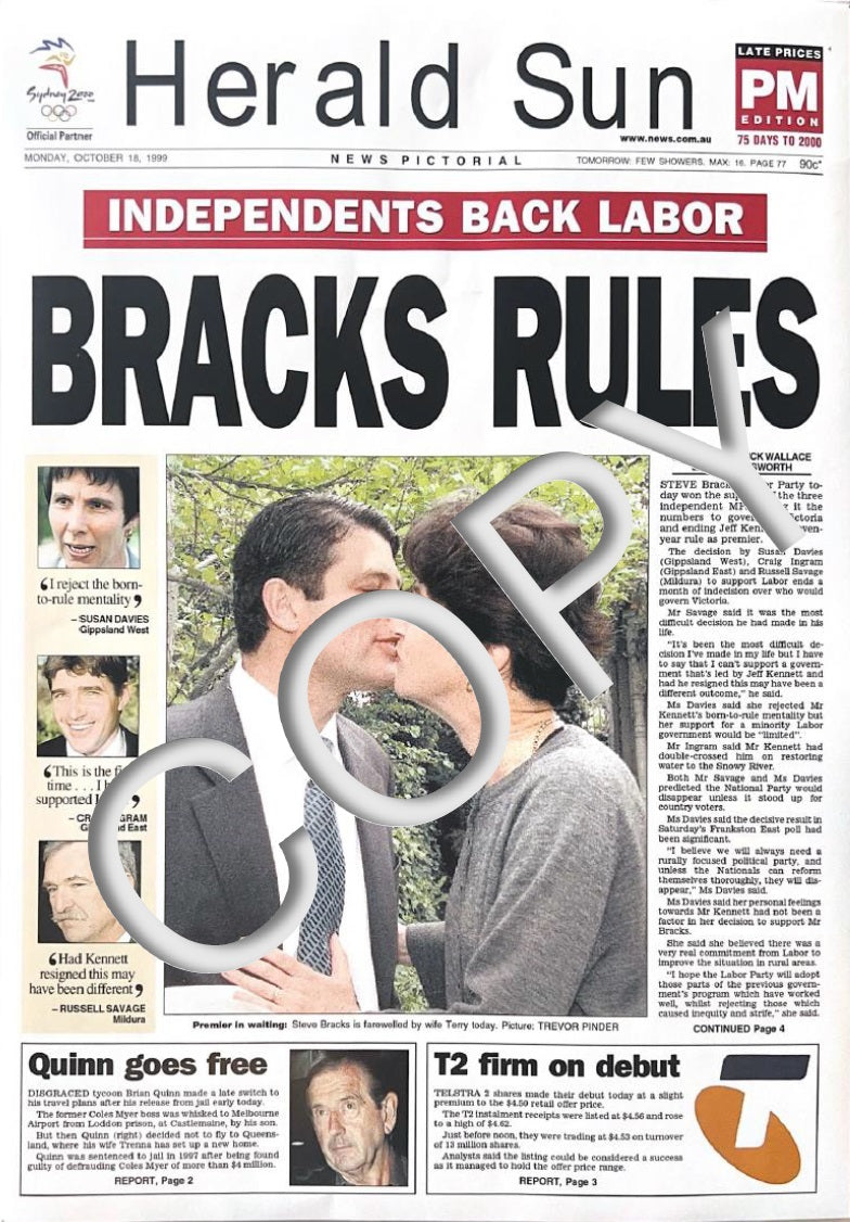 Authentic prints of iconic front-page newspapers commemorating landmark moments in Victorian Labor's...